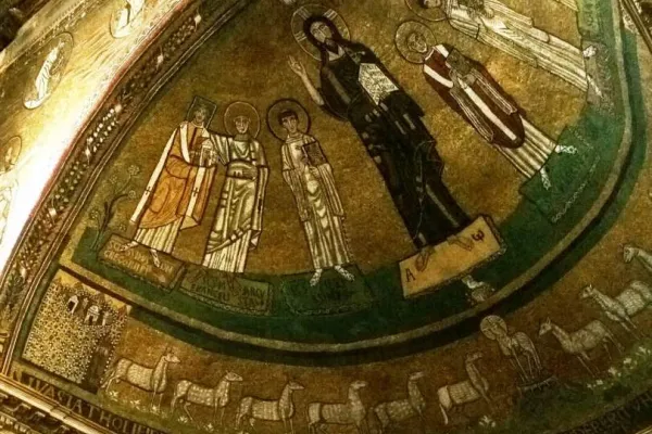 Per la fama di questa traslatione come io credo, & perché anco era Gregorio Quarto stato titolare di questa chiesa, si mosse a rinovarla da fondamenti, & ornarla dove anco vi dura la Tribuna (l’abside) da lui fatta di Musaico dipingere già più di 750 anni. Quivi è scolpito il nostro Salvatore con san Marco Evangelista, an Marco Papa, & altri Santi.”