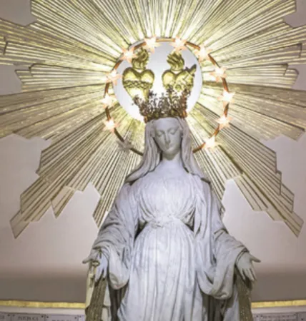 Bisogna tornare a rue du Bac, esattamente all’anno 1830, nel convento delle figlie della carità di San Vincenzo de’ Paoli. Vi si trova, per compiere il suo noviziato, Catherine Labouré, figlia di contadini agiati, che ha deciso di farsi suora, contrariamente ai progetti familiari. La mandano a fare la cameriera in un’osteria, presso un parente, nella speranza di farle cambiare idea. Caterina è una ragazza semplice, ma con una fede schietta e spontanea e non solo non cambia idea, ma prende la decisione irrevocabile di farsi suora. Una sera di novembre, la ragazza, nella sua cella dove sta dormendo, si sveglia e vede un bambino ai piedi del letto, che le dice di seguirlo, perché la Madonna vuole incontrarla. Spaventata, ma senza pensare minimamente a dubitare o a fuggire, la ragazza segue il bimbo fino alla cappella. Quello sarà il primo di una breve serie di incontri, con apparizioni, colloqui, e anche gesti, vere e proprie manifestazioni d’affetto. Durante la seconda di queste apparizioni la Vergine chiede alla giovane di far coniare una medaglia , segno di amore, pegno di protezione e sorgente di grazie per tutti coloro che avessero avuto quell’oggetto e avessero confidato in esso. Maria mostra in tutti i dettagli come avrebbe dovuto essere questa medaglia, istruendola a dovere. Non sarà facile, per Caterina, far comprendere che le sue non sono fantasie o allucinazioni, come sempre accade nella storia delle apparizioni. Ma riesce a farsi credere e la medaglia comincia il suo cammino nel mondo.