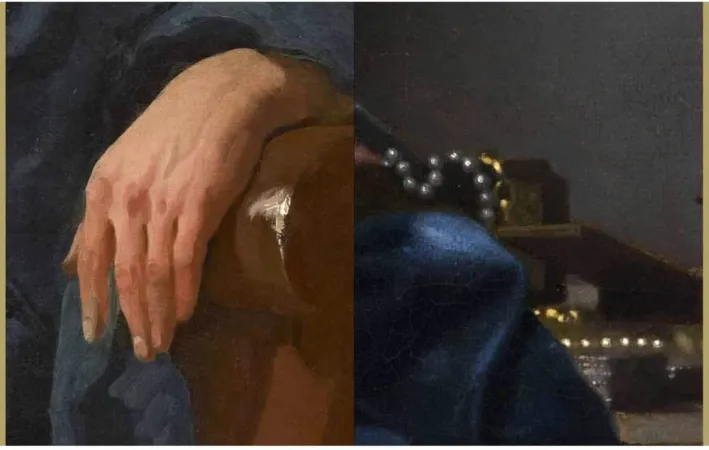 Le origini di Vermeer sono protestanti: Johannes viene battezzato nella Nieuwe Kerk di Delft, la chiesa dove è sepolto Guglielmo il Taciturno. Il suo matrimonio con Caterina Bolnes lo porta dalla parte cattolica, e Gregor Weber mostra le ragioni di un’appartenenza cattolica di cui il nome dei figli è la prima testimonianza: uno sarà battezzato con il nome di Ignatio, come il fondatore della Compagnia, e gli altri con nomi di santi cattolici: Francesco, Gertrude, Cornelia, Elisabetta, Beatrice. Pensiamo al quadro dedicato a Santa Prassede, che secondo la leggenda fu perseguitata e uccisa perché seppelliva martiri cristiani; così come, accanto a quest’opera, nella mostra, è esposto il grande dipinto di Gesù nella casa di Marta e Maria, due tele del 1655, in uno stile che deve qualche ispirazione al Rinascimento italiano. Il che fa domandare quali viaggi possa aver fatto il giovane Vermeer, magari anche in Italia e Francia, prima di concentrare tutta l’esistenza successiva a Delft a dipingere e commerciare opere d’arte (il padre gli aveva lasciato questa attività già avviata).