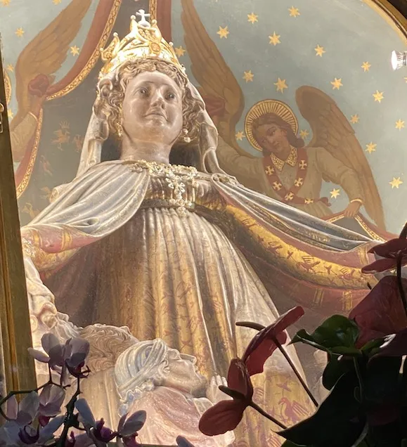 I milioni di pellegrini che ogni anno si sono affollati lungo queste strade, nella chiesa, nello spettacolare piazzale che domina il paesaggio montano si sono visibilmente ridotti, ma il flusso di persone non è cessato. Famiglie intere, anziani accompagnati da parenti o badanti, salgono i gradini, come per secoli è stato fatto, e siedono davanti a Maria, ancora una volta sostegno e speranza in un tempo segnato dalla paura e dalla malattia. L’antica peste oggi è una pandemia che scuote il mondo, e si cura più rapidamente ed efficacemente, ma che lascia segni dolorosi su tutto e tutti, stravolgendo le nostre vite e le nostre sicurezza.