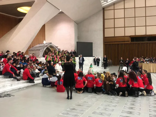 “Questi bambini, questi ragazzi fanno cose meravigliose! Sono contento, sono contento di vedervi fare così! Anche voi cantate bene, molto bene! Siete bravi. E la torta sembra che è buona... Possiamo mangiarla? Sì? Tutti insieme… O aspettiamo? Aspettiamo, è più prudente...