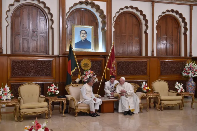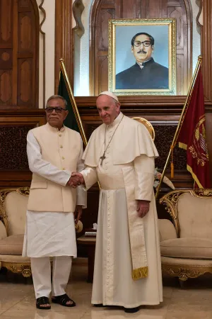 Terzo pontefice a visitare il Bangladesh, Papa Francesco prima di arrivare a parlare con le autorità passa dal National Martyr’s Memorial, e poi rende omaggio al padre della Nazione, Sheih Mujibur Rahman, andando nel memoriale a lui dedicato, il “Banghabandu Memorial Museum”, che altro non è che la casa del leader che fu trucidato insieme a gran parte della sua famiglia, e poi incontra privatamente il presidente del Bangladesh.