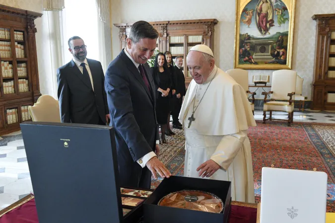 Il presidente Pahor ha invece donato una raccolta di pannelli di alveare, tipici della Slovenia, e un volume sulle api e il loro rapporto con l’uomo, ma anche una “potička”, dolce tipico sloveno, che il Papa ha mostrato di conoscere ed apprezzare – una delle sue nipoti, Maria Ines, è sposata ad un uomo sloveno.