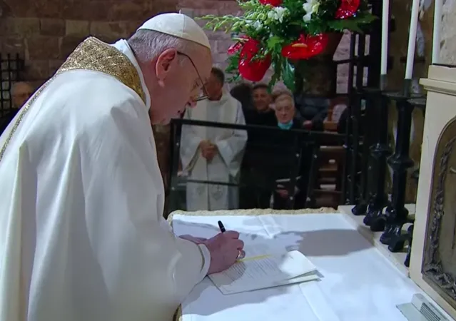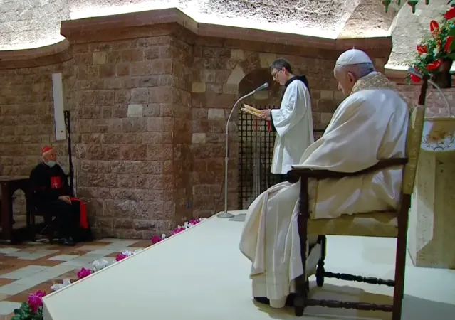 Poi la celebrazione della messa in forma strettamente privata ma in diretta tv e streaming sulla tomba di San Francesco. Presenti solo pochi religiosi come rappresentanza delle varie famiglie francescane, e il cardinale Vallini legato pontificio per le basiliche di San Francesco e di Santa Maria degli Angeli il vescovo Sorrentino e il sindaco Stefania Proietti.