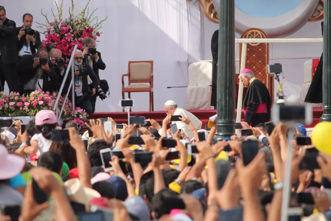 È il culmine di una intensa giornata, per Papa Francesco. Dopo l’incontro con sacerdoti, religiosi e seminaristi delle circoscrizioni Nord, che ha fatto seguito alla Messa del mattino e ad una visita nel quartiere Buenos Aires, va nella Plaza de Armas, gremita di pellegrini arrivati da ogni dove, che hanno trasformato la piazza – dice il Papa – “in un santuario a cielo aperto in cui tutti vogliamo lasciarci guardare dalla madre, dal suo materno e tenero sguardo”.