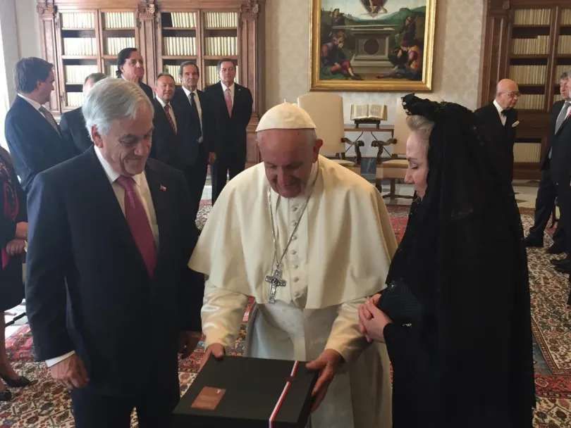 Accompagnato dalla moglie, dal ministro degli Esteri Roberto Ampuero, da sei senatori e sei deputati e due imprenditori locali, Piñera ha regalato a Papa Francesco una scatola di lapislazzuli, creata da una fondazione presieduta dalla First Lady Cecilia Morel e che ha voluto un mese di lavoro.