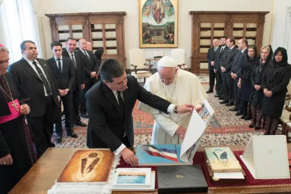 A due anni dalla visita di Papa Francesco in Paraguay, il presidente Horacio Cartes viene in Vaticano, accompagnato da una delegazione composta da Eladio Loizaga, Cancelliere, dal segretario di Stato Juan Carlos Lopez Moreira, dal suo segretario particolare, suo segretario privato, altri membri dello staff, e le sue due figlie (il presidente ha anche un figlio maschio), Sofia e Sol, vestite di nero e velate, secondo protocollo.