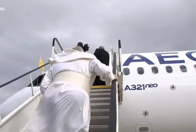 Il Papa sale per ultimo a bordo dell’aereo A320neo dell’Aegean per far rientro in Italia.