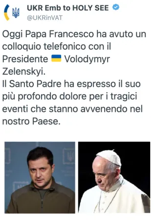 Il Papa, come ha fatto sapere l’ambasciata Ucraina presso la Santa Sede sempre con un tweet, ha telefonato in serata a Zelenskyi: “ Il Santo Padre ha espresso il suo più profondo dolore per i tragici eventi che stanno avvenendo nel nostro Paese”. La notizia è stata confermata dalla Sala Stampa della Santa Sede.
