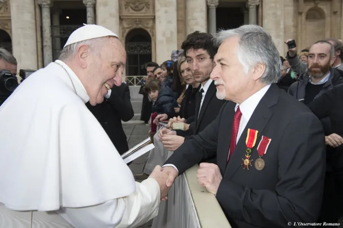 Rinaldo Marmara e Papa Francesco | Rinaldo Marmara presenta il libro Rinaldo Marmara e Papa Francesco | Rinaldo Marmara presenta il libro "La squadra pontificia ai Dardanelli" a Papa Francesco, 3 febbraio 2016 | L'Osservatore Romano