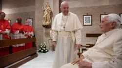 Anche al termine di questo concistoro in cui ha creato 20 nuovi Cardinali Papa Francesco ha accompagnato i nuovi porporati a salutare il Papa emerito Benedetto XVI al Monastero Mater Ecclesiae, in Vaticano.