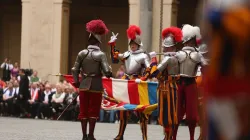 Mancavano pochi minuti alla cinque quando Papa Leone XIV è sceso nel Cortile di San Damaso allestito per il Giuraento delle nuove reclute della Guardia Svizzera Pontificia.