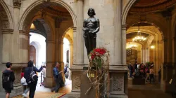 Il corpo marmoreo è adagiato sotto una grande riproduzione della Sindone, illuminato da una tipedia luce.