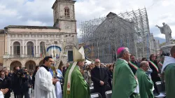 “Il terremoto tra il 26 e il 30 ottobre 2016 sconvolse il normale ritmo della vita di queste terre, ricche d’arte, di bellezze paesaggistiche e di tradizioni culturali, che hanno trovato la loro più solida ispirazione nella fede cristiana”. Con queste parole il cardinale Pietro Parolin, Segretario di Stato Vaticano, ha avviato l’omelia nella piazza di San Benedetto a Norcia, dinanzi alla facciata ingabbiata della basilica, crollata, del Santo patrono d’Europa.