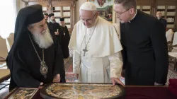 "Questo incontro mi offre l’opportunità di esprimere nuovamente la mia vicinanza a tutti coloro che soffrono per i conflitti che da decenni affliggono la Terra Santa. L’incertezza della situazione e l’incomprensione tra le parti continuano a causare insicurezza, limitazione di diritti fondamentali e l’abbandono della propria terra da parte di molti. Per questo invoco l’aiuto di Dio e chiedo a tutti i soggetti coinvolti di moltiplicare gli sforzi affinché si realizzino le condizioni di una pace stabile, basata sulla giustizia e sul riconoscimento dei diritti di tutti". Lo ha detto stamane Papa Francesco, nel corso dell'udienza a Theophilos III, Patriarca Greco Ordotosso di Gerusalemme.