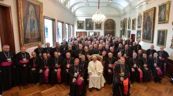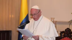 Presso il Palazzo Cardinalizio di Bogotà Papa Francesco incontra i Vescovi Colombiani. Sono circa 130 Vescovi, il Papa viene accolto dal Presidente della Conferenza Episcopale, che lo accompagna al podio.
